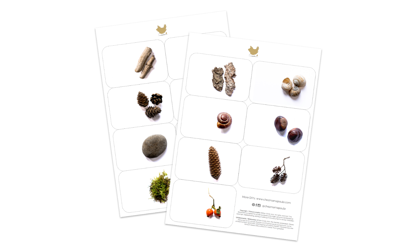 Für dieses Zuordnungsspiel braucht ihr kein zusätzliches Spielzeug zu besorgen, sondern euch auf eine Schatzsuche im Wald begeben. Die dort entdeckten Naturmaterialien können Kinder zu Hause untersuchen und/oder den entsprechenden Kärtchen zuordnen.