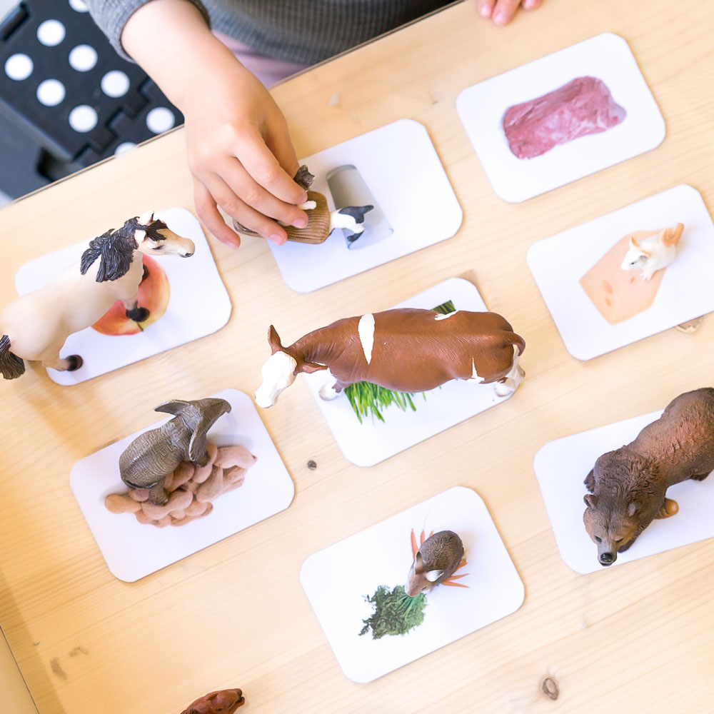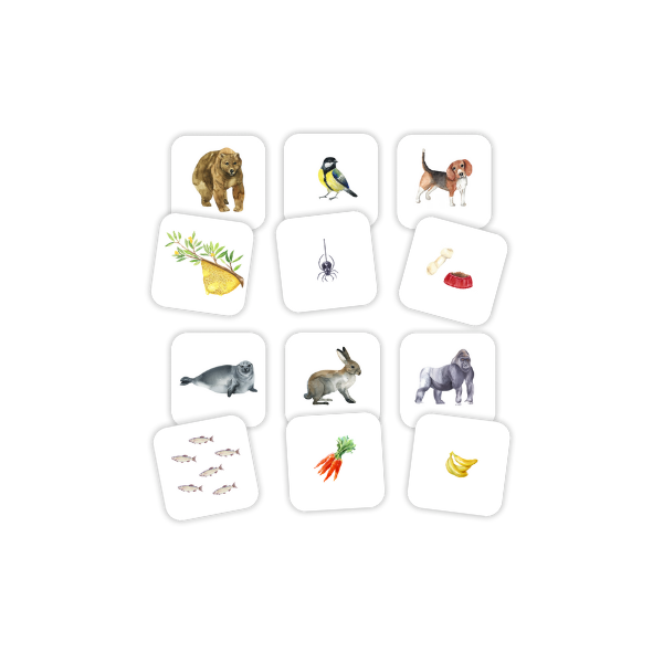 Die Idee hinter dem Spiel ist einfach: Dem Kind werden mehrere Kärtchen mit Nahrungsmitteln angeboten, seine Aufgabe ist es, die passenden Tierfiguren zu finden und diese einander zuzuordnen. Das Spiel macht Spass und Kinder lernen Gleiches zu erkennen, Ordnen und Kategorisieren, sie üben die Feinmotorik.